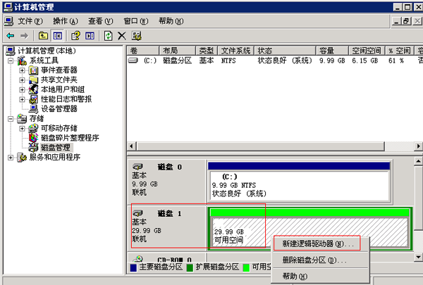 5 .再次右键点击磁盘,选择新建逻辑驱动器.出现下图: