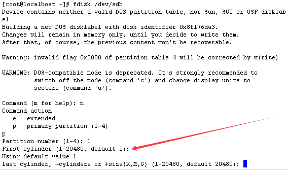 6、First Cylinder是选择该分区的起始磁盘数,这里可自定义也可不做选择,默认是1,如无特殊需求强烈建议选择默认,也就是1来分区(直接按回车)